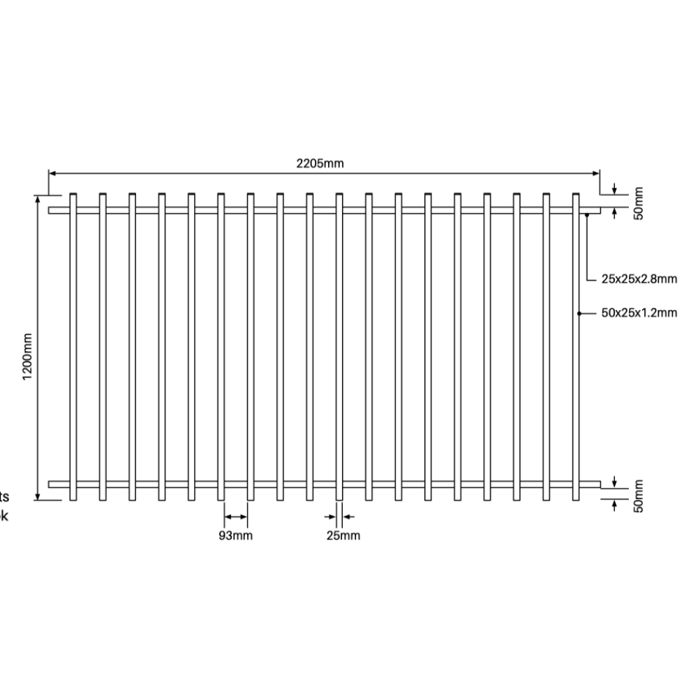 • Sturdy 25x25x2.8mm horizontal top/bottom rails pass through the centre of punched pickets